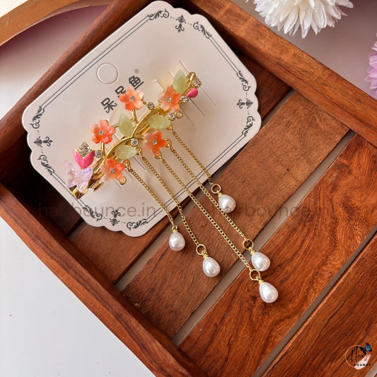 Celestial Blossom Pearl Tassel Hair Clip – Elegant Floral Dangle Barrette