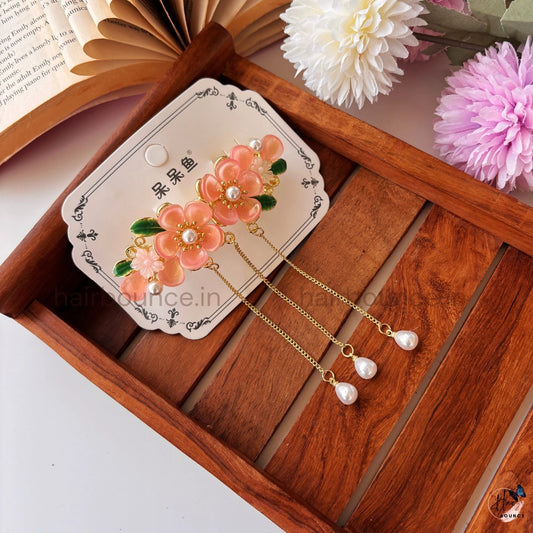 Blossom Pearl Chain Hair Clip – Elegant Floral Dangling Metal Barrette