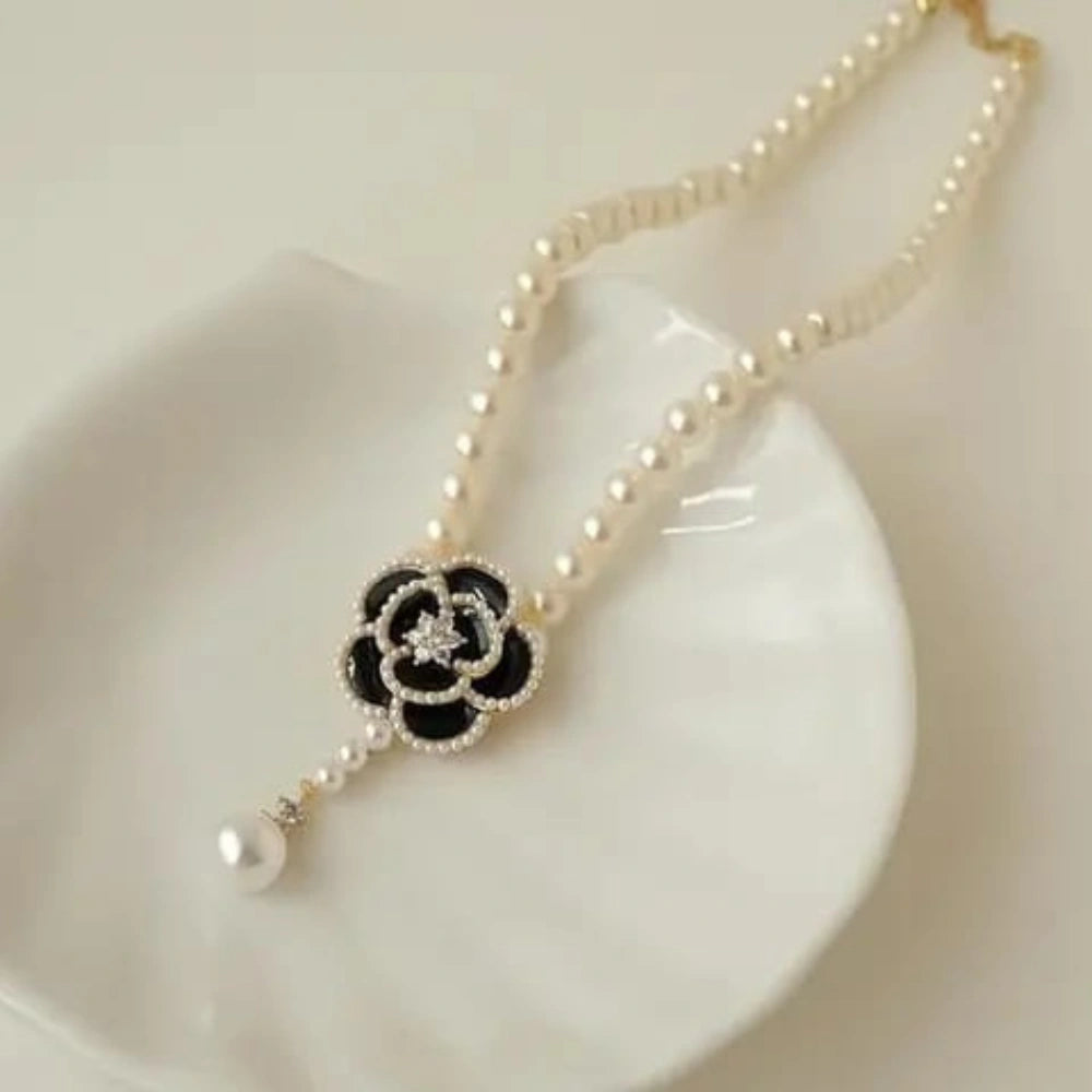 The pearl with flower necklace beautifully combines the classic elegance of lustrous pearls with charming floral accents, creating a stunning piece of jewelry. Perfect for adding a touch of sophistication to any outfit, this necklace is ideal for both casual wear and special occasions, exuding a timeless and feminine appeal.