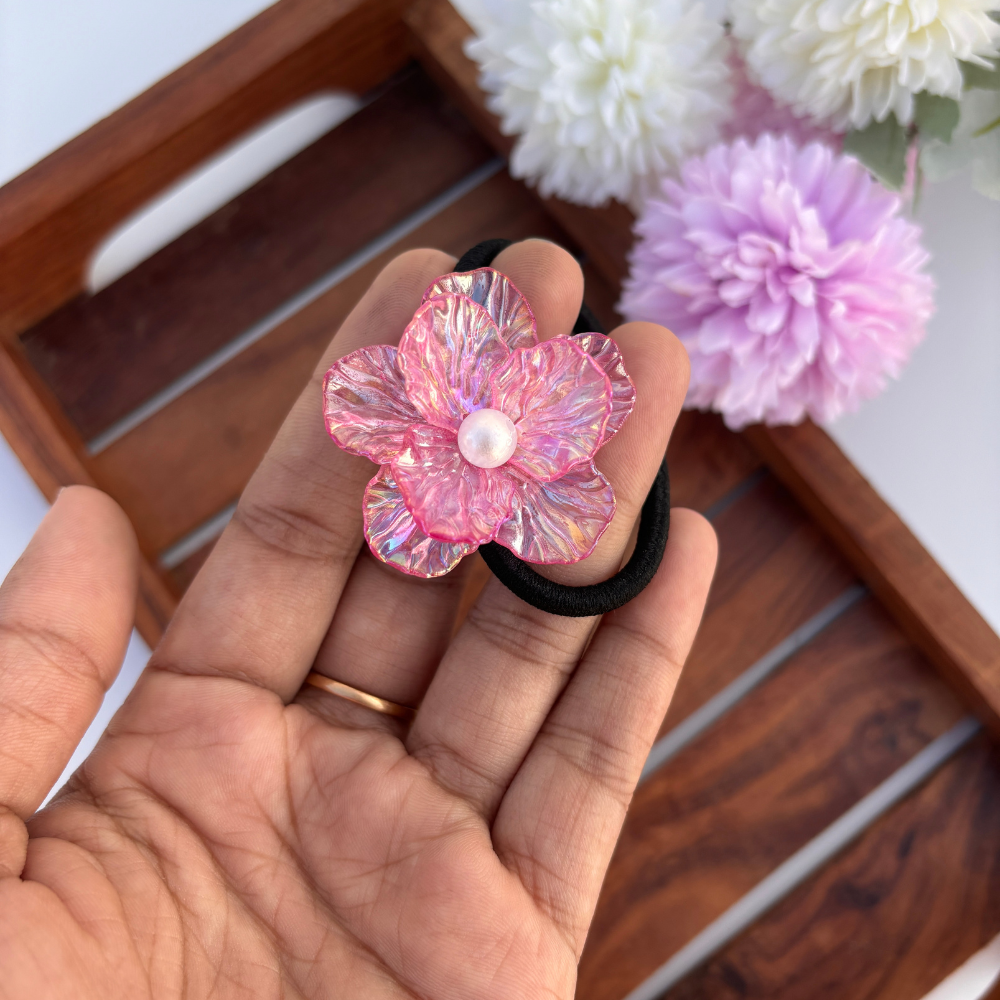 Delicate and dreamy, this hair tie features a shimmering pink flower with a soft pearl center. A perfect blend of charm and elegance for everyday or special looks.