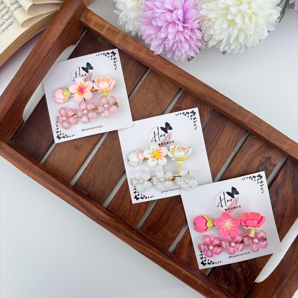 Vibrant mix of pink and red florals with glossy pearl accents — fun and cheerful for any day out.