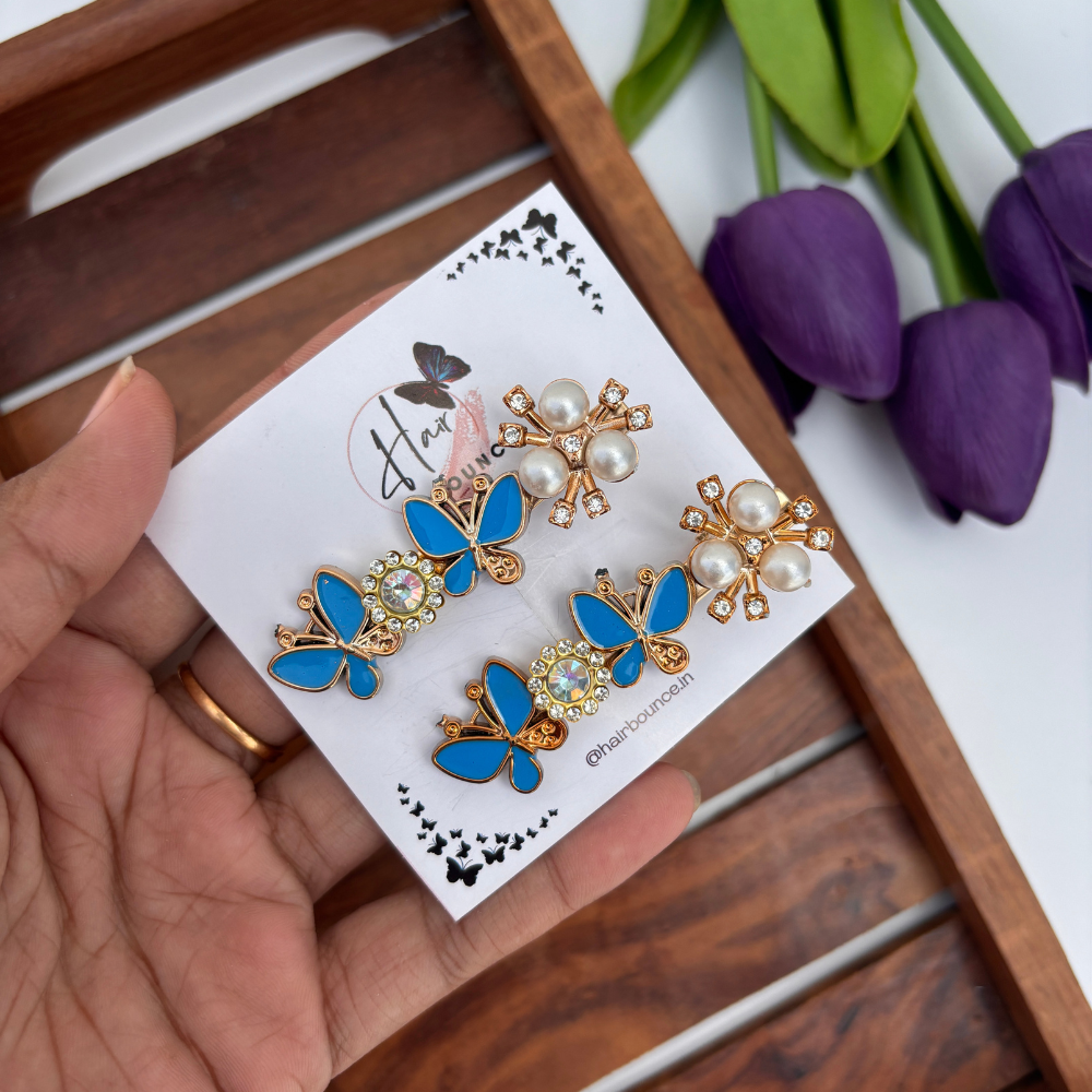 Delicate butterfly wings paired with a radiant pearl center, set on a secure alligator clip. A charming accessory to add elegance and grace to your hairstyle.