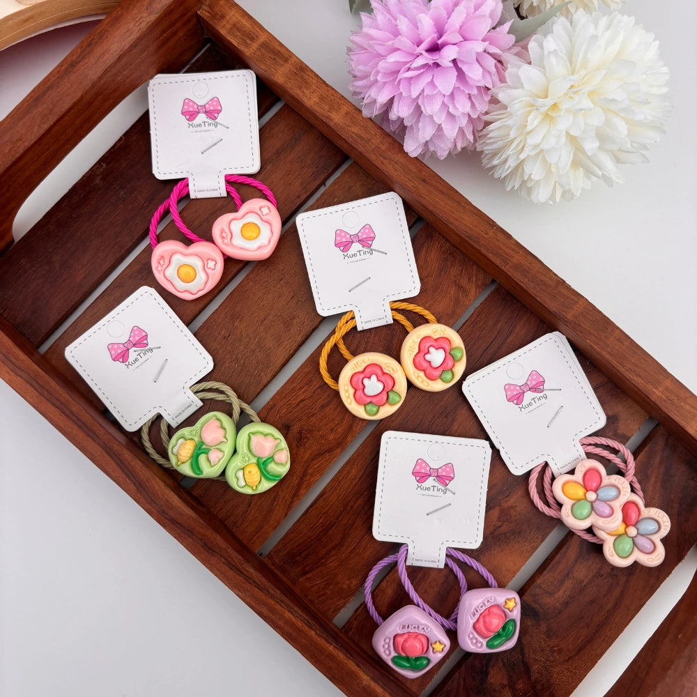 A playful pack of colorful hair ties featuring heart, flower, and candy-inspired charms. Made with soft elastic for a secure yet gentle hold, these cute accessories are perfect for kids and fun hairstyles.