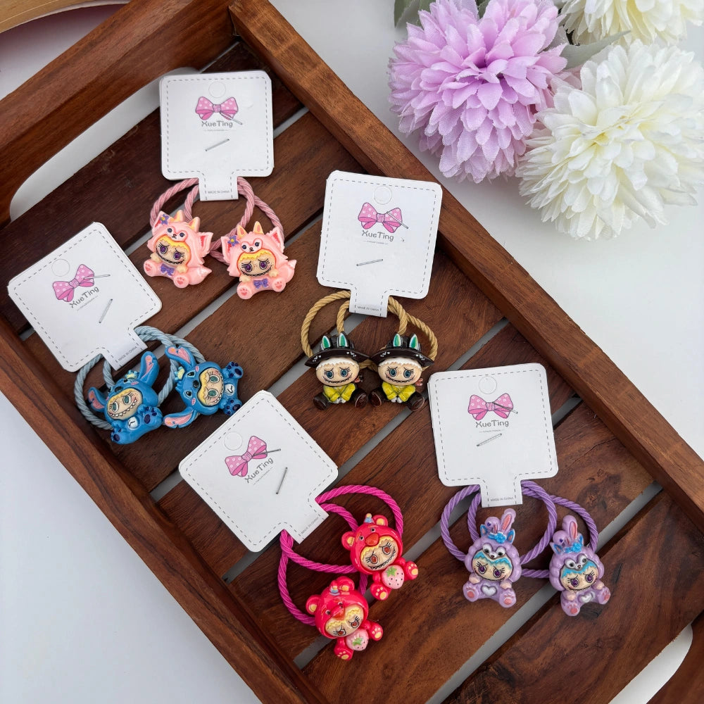 A quirky collection of cartoon-inspired hair ties featuring colorful characters in playful costumes. Soft, stretchable elastics make them comfortable for daily wear while adding a fun pop to kids’ hairstyles.