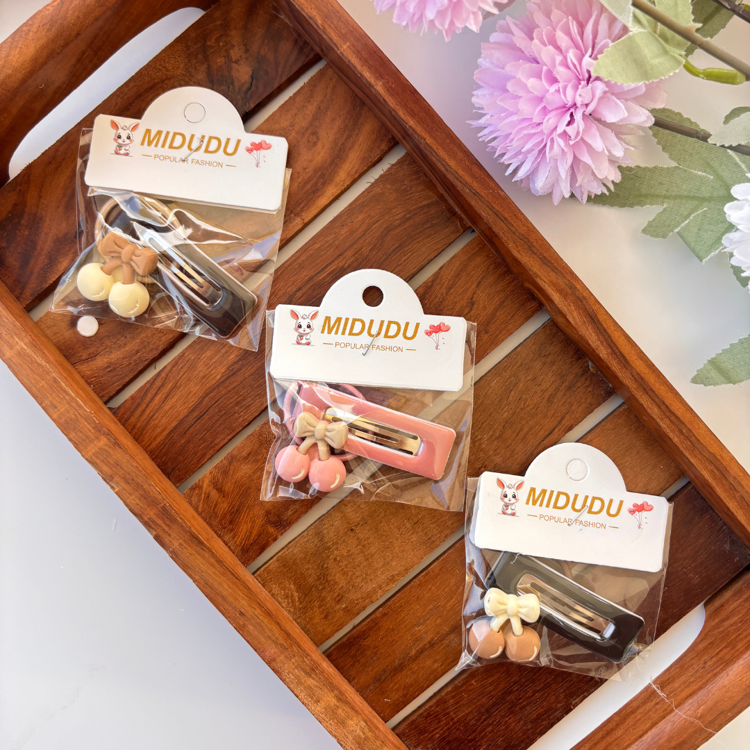 Add a touch of charm and sweetness to your hairstyle with our Cherry Bow Hair Clip Set! Featuring glossy pastel cherries tied with a dainty bow, these clips bring the perfect mix of elegance and playfulness. Ideal for casual looks, parties, or gifting!