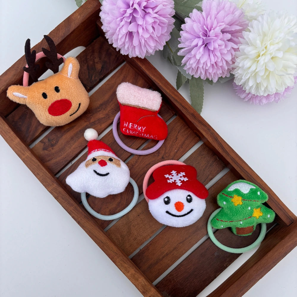 Celebrate the season with this adorable set of plush Christmas-themed rubber bands—featuring Santa, a snowman, reindeer, stocking, and Christmas tree. Perfect for holiday hairstyles, gifts, or party favors!