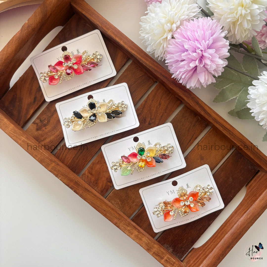 Add a touch of elegance to your hairstyle with our Crystal Bloom Center Hair Clip. Designed with delicate floral motifs, sparkling crystals, and luxe gold-tone accents, this clip instantly elevates both everyday and occasion looks. The sleek center-clip design offers a secure hold while adding graceful charm to your hair.