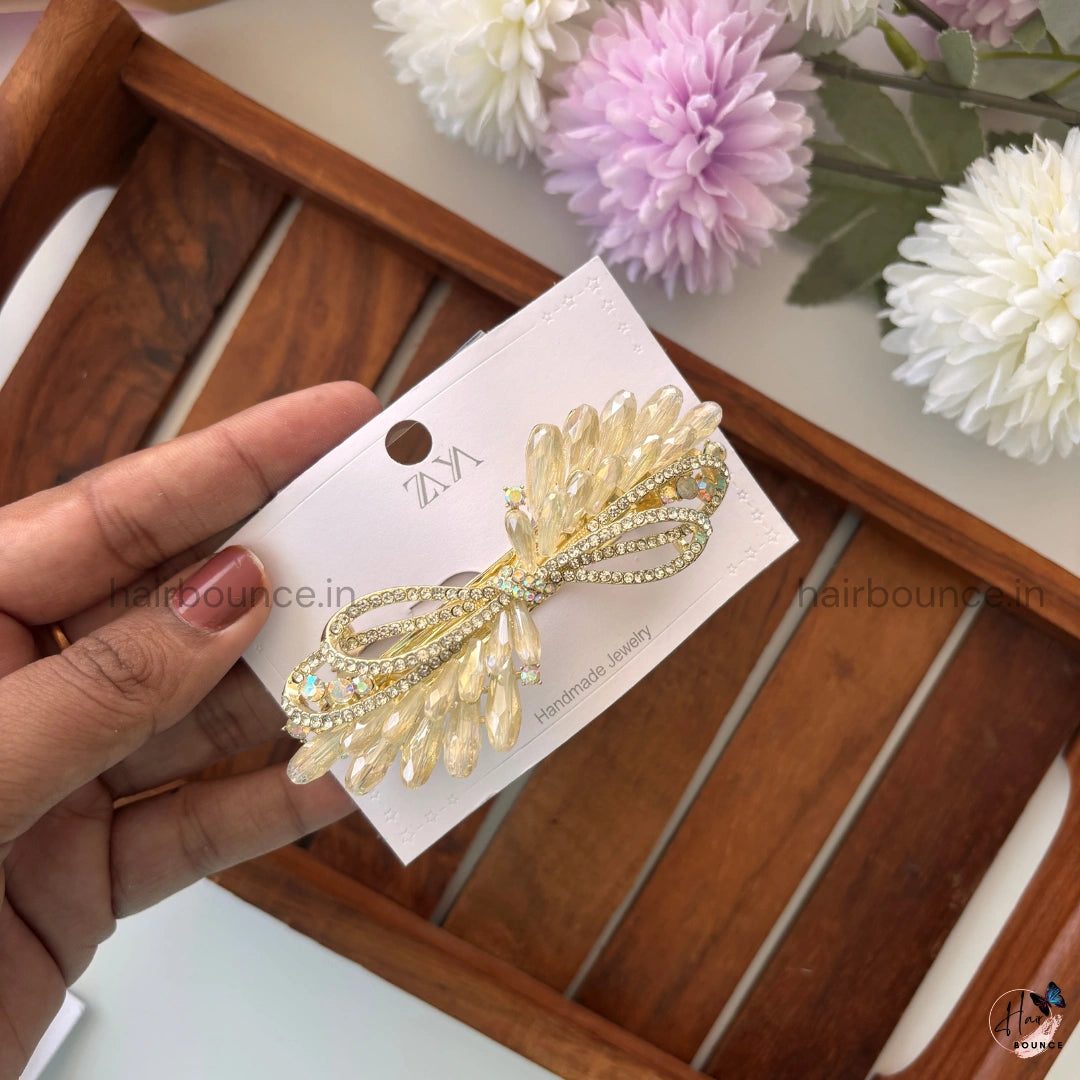 Add refined elegance to your hairstyle with the Crystal Feather Bow Bar Clip. Featuring graceful feather-shaped crystal drops arranged on both sides of a sparkling bow centerpiece, this clip radiates subtle luxury and movement. The gold-tone crystal-outlined bow adds a classy finish, while the sturdy bar clasp ensures a secure and comfortable hold. Perfect for festive wear, weddings, parties, or elevating everyday outfits, this clip is a timeless statement of sophistication and charm.
