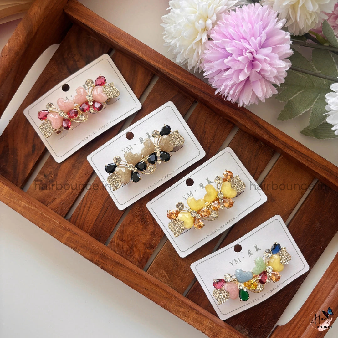 Make a graceful style statement with our Crystal Heart Butterfly Center Hair Clip, designed to blend romance and elegance effortlessly. Featuring delicate butterfly shapes crafted with heart-inspired crystal stones, this clip is finished with shimmering accents and a luxe gold-tone base.