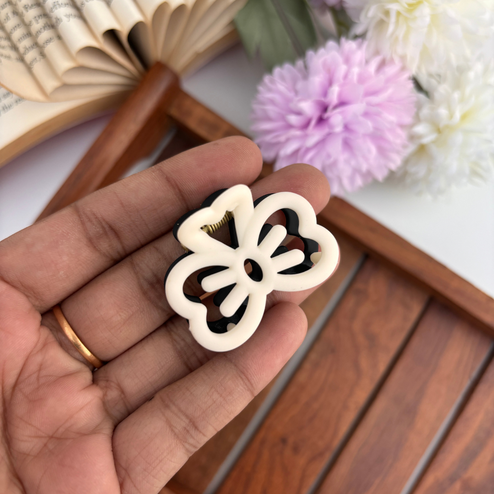 A chic bow-shaped hair claw designed with a dual-tone finish for a stylish twist. Its compact size makes it perfect for half-up styles or securing small sections of hair with ease. Lightweight yet strong for everyday use.