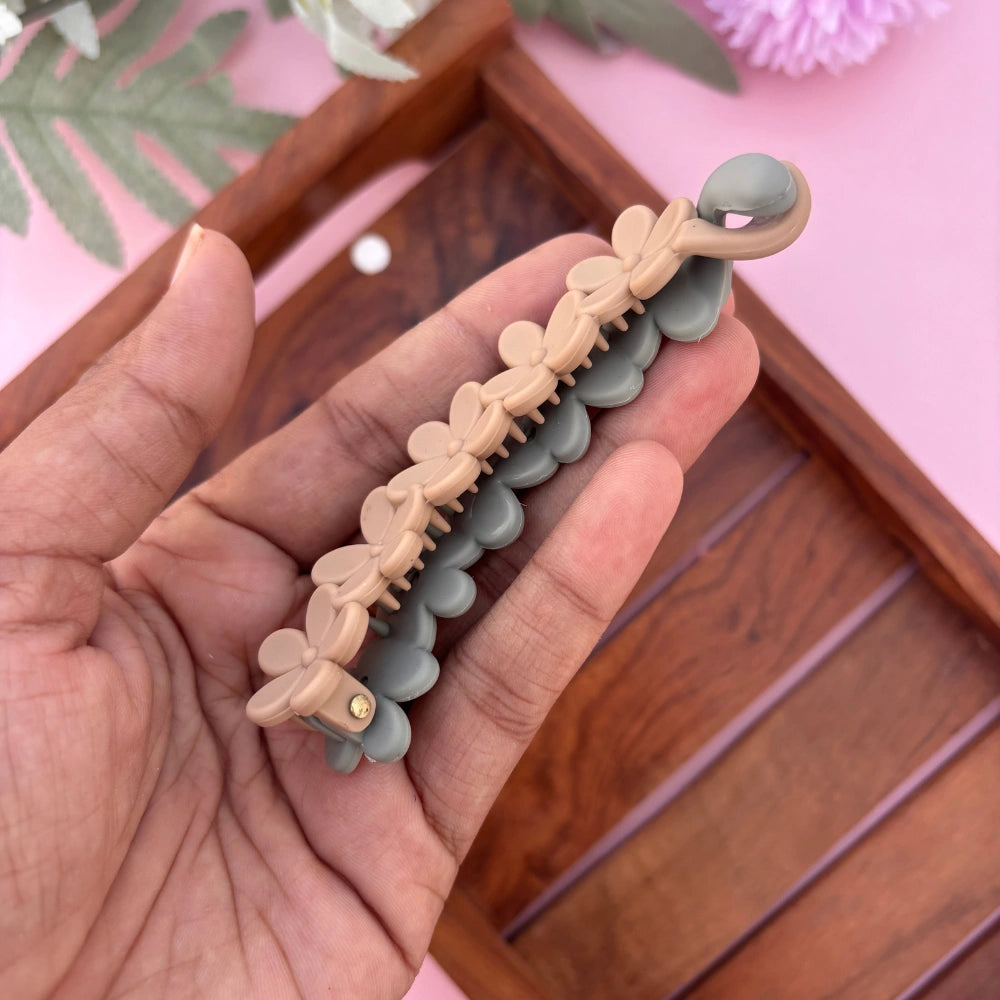 The Dual Colour Flower Lock Banana Clip combines elegance with functionality, featuring a floral design in two complementary colors. Its secure locking mechanism ensures a firm hold while adding a stylish, feminine touch. Perfect for creating chic hairstyles with ease and flair.