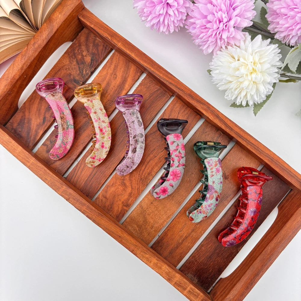 Stylish curved banana clips featuring vibrant floral prints and a secure grip. Perfect for ponytails, half-up styles, and adding a pop of color to your everyday look.