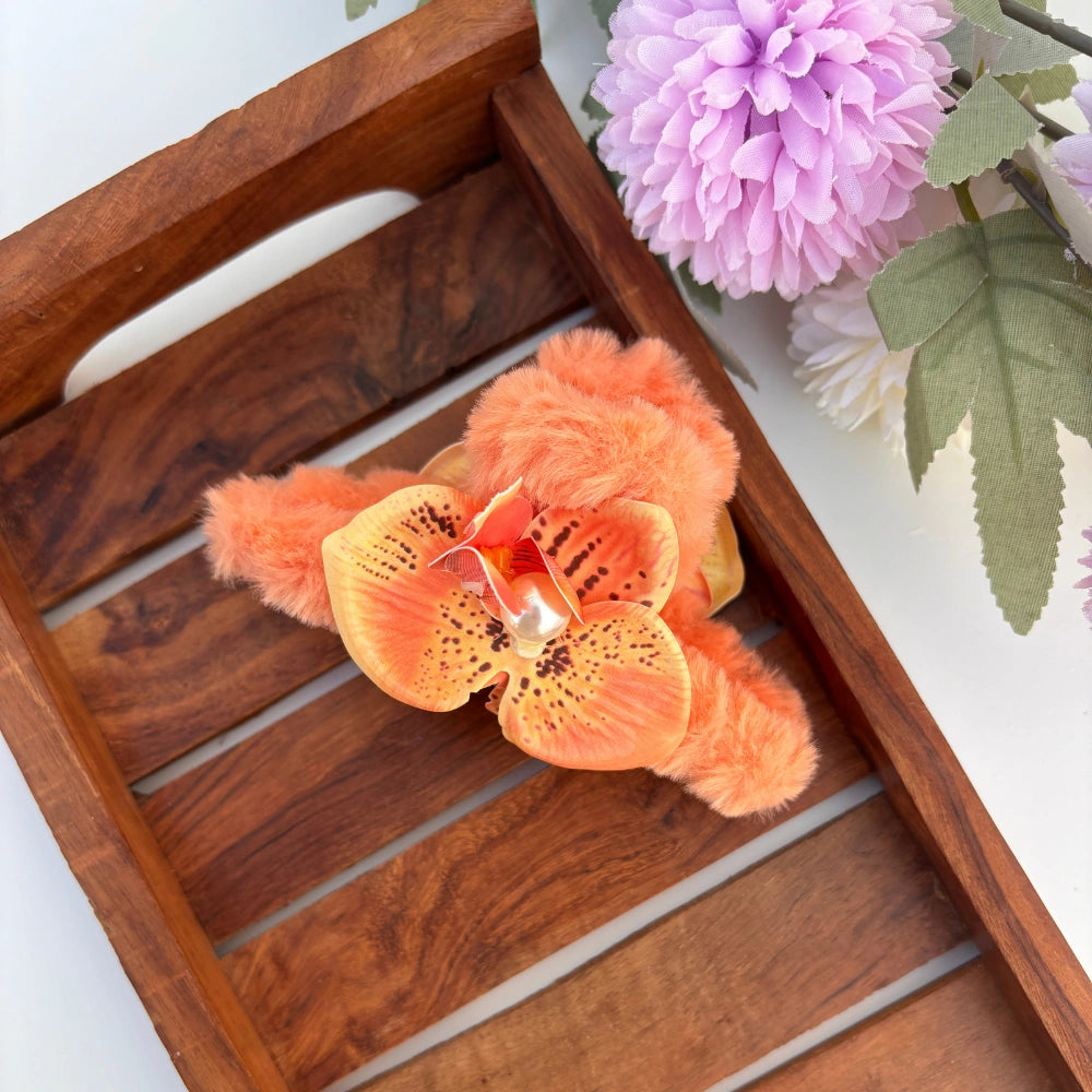 A soft, fluffy band topped with a vibrant orchid flower and pearl center—this hairband brings a touch of elegance and charm to any little girl's look.