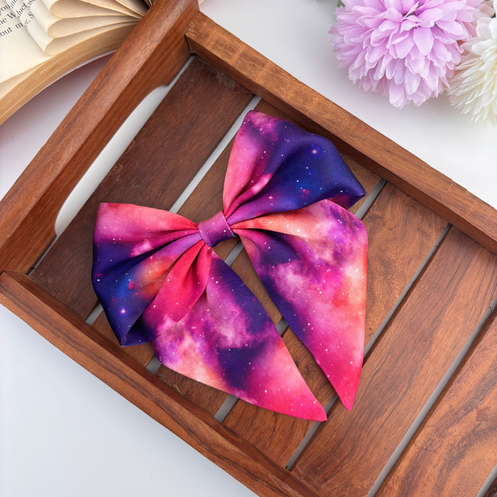 A dreamy sailor bow featuring a stunning galaxy print in cosmic pinks, purples, and blues. This statement piece adds a celestial charm to your hairstyle, making it perfect for both festive nights and chic everyday looks.