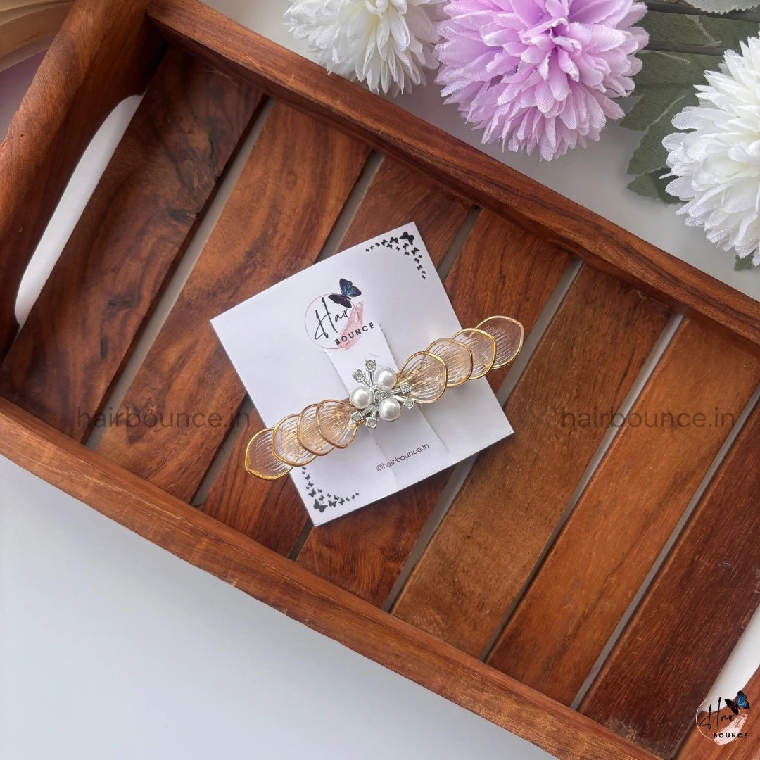 Add effortless sophistication to your hairstyle with the Champagne Pearl Bloom Barrette Hair Clip. Crafted with transparent champagne-toned petals framed in elegant gold edges, this barrette is beautifully finished with a luxurious pearl and crystal floral centerpiece, giving it a refined, premium look.