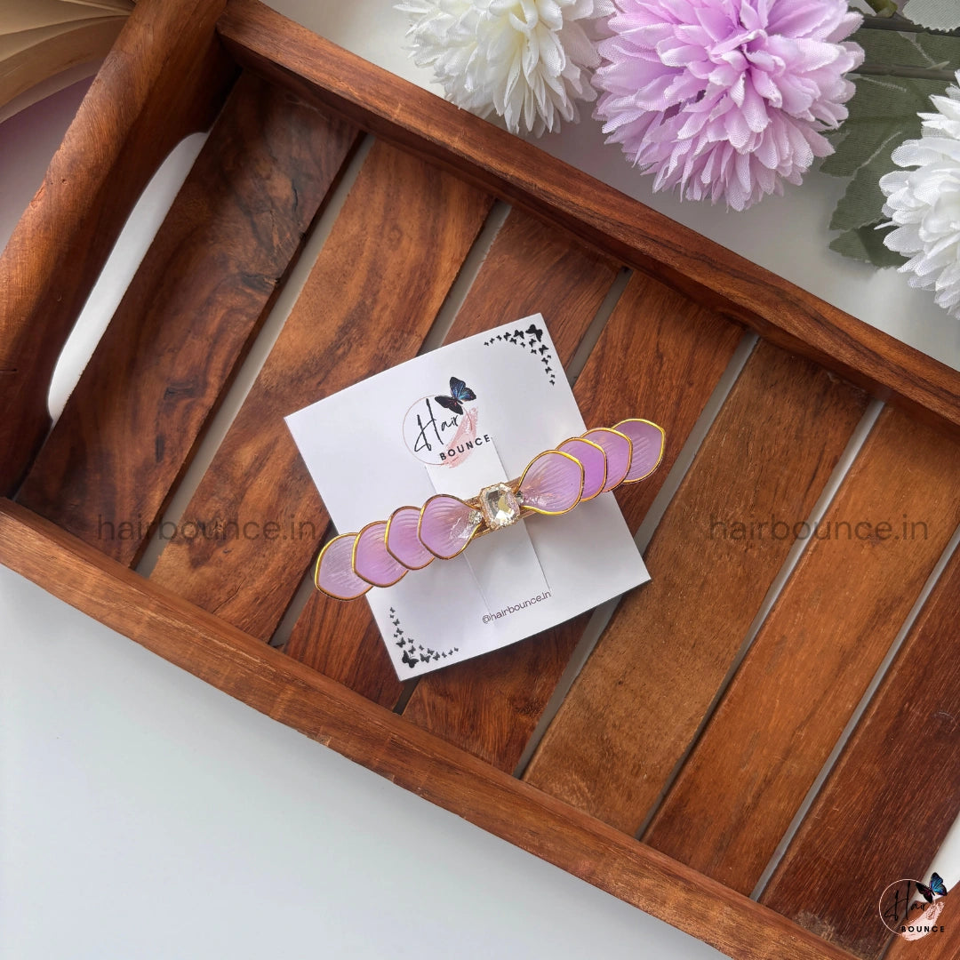 The gentle pearl-sheen texture gives it a dreamy, feminine look, while the sleek metal barrette clasp ensures a strong yet comfortable hold. Whether styled with half-up hair, low buns, or side-swept looks, this clip instantly adds a polished finish.