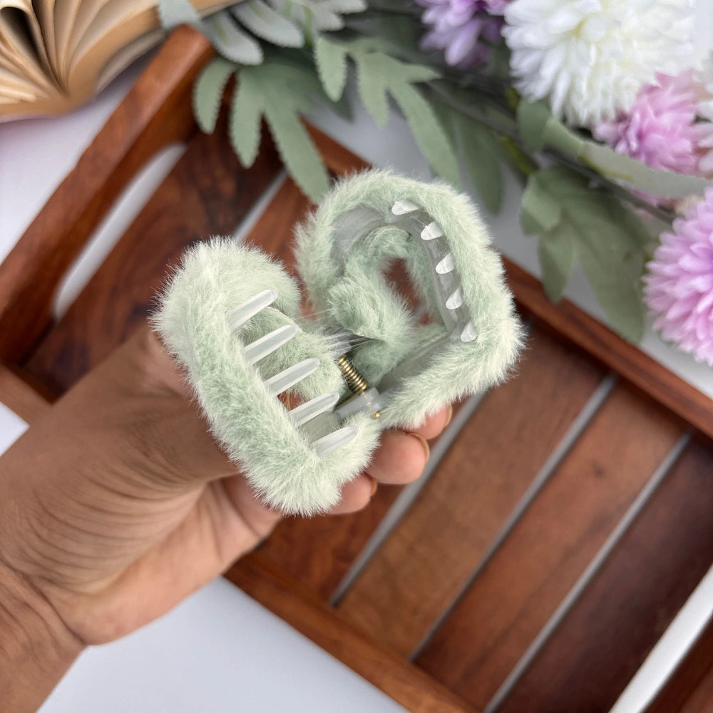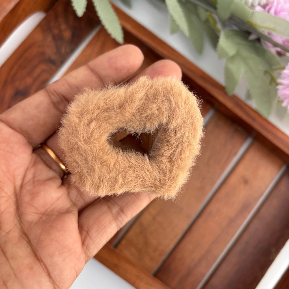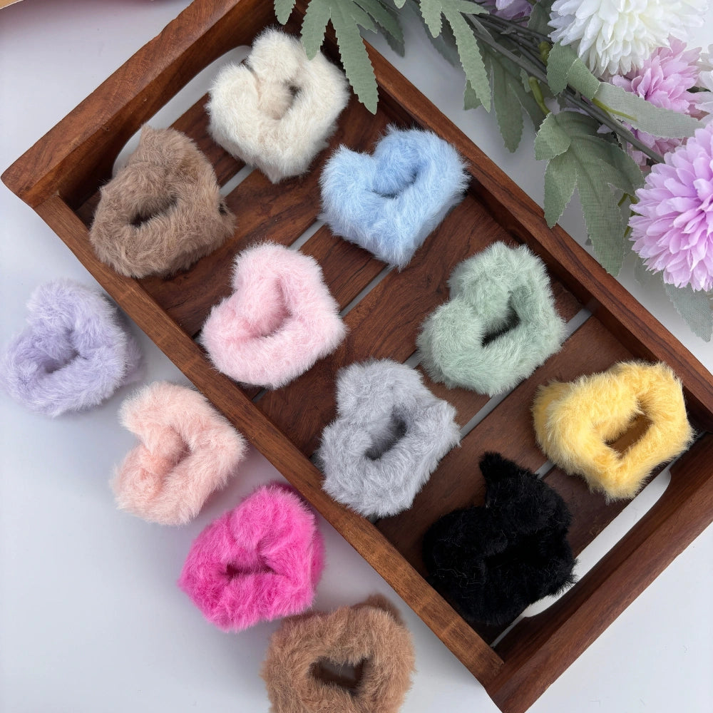 A cute small-sized hair claw designed in a heart shape with soft fur detailing. Lightweight, cozy, and stylish — perfect for adding a playful charm to your everyday hairstyles.