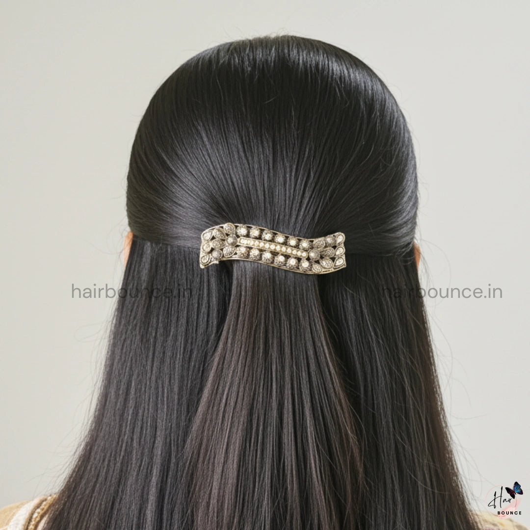 An exquisite blend of tradition and elegance, this antique-finish center clip is adorned with shimmering kundan stones and delicate leaf motifs. Its intricate detailing and golden finish give it a regal look, making it the perfect accessory for festive occasions, weddings, and ethnic wear. Strong and durable yet graceful, this clip adds a luxurious charm to any hairstyle.