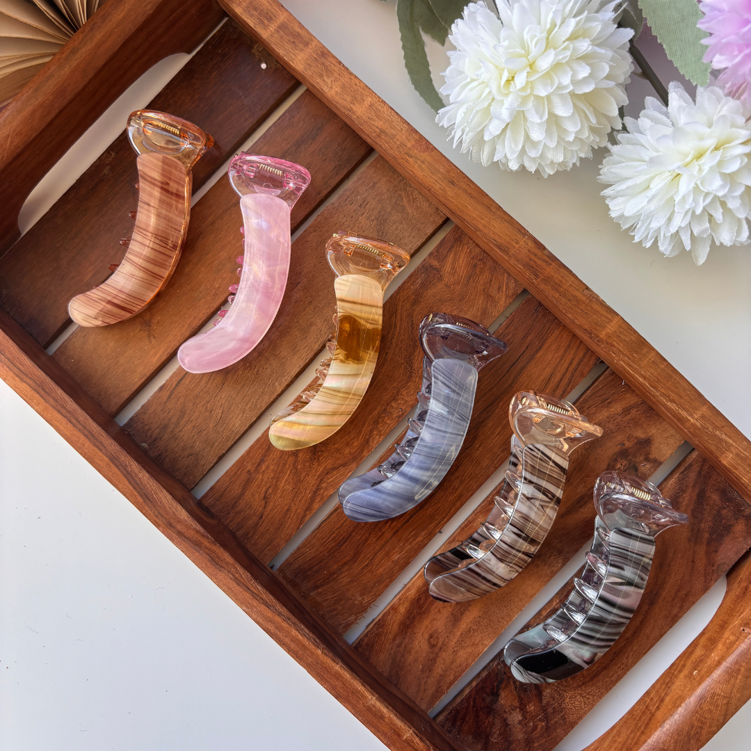 Stay effortlessly chic with this stylish lined print banana clip. Its medium size ensures a firm and comfortable grip, keeping your hair neatly in place while adding a modern, trendy touch to your look. The sleek lined pattern gives it a sophisticated edge, making it perfect for both everyday wear and special outings. Durable, lightweight, and versatile—this clip is a must-have for your accessory collection.