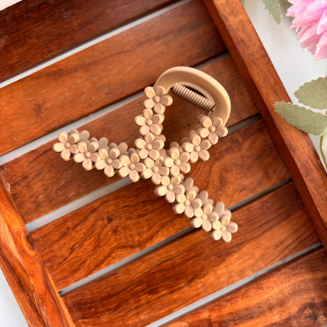 A chic and versatile hair accessory featuring an elegant looped flower design. Perfect for securing your hair with style, it combines sophistication with functionality. Ideal for both casual outings and special occasions, this hair claw adds a delicate floral charm to any hairstyle.