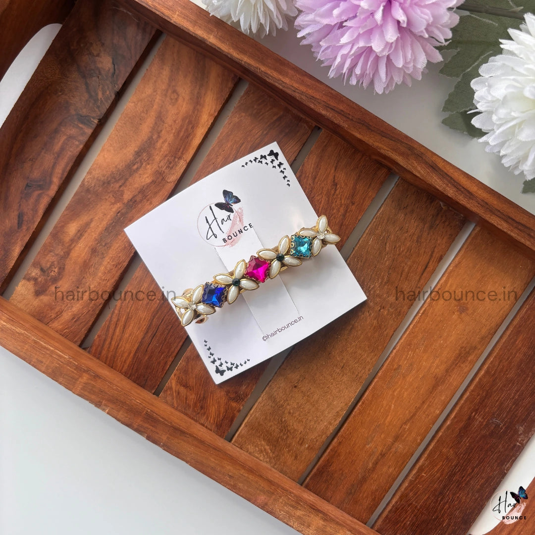 Add a burst of colour and elegance to your hairstyle with the Multicolor Floral Crystal Barrette Hair Clip. This exquisite piece features vibrant square-cut crystals in royal blue, ruby pink, and aqua tones, beautifully framed by delicate pearl-finish floral motifs in a rich gold-tone setting.