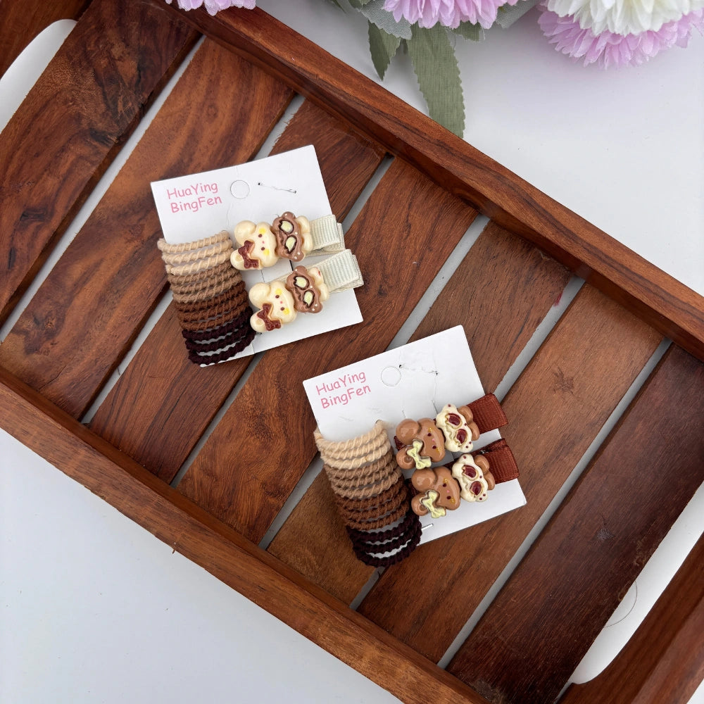 A subtle blend of soft nude tones, this set features cute toy-themed alligator clips and matching rubber bands—perfect for stylish, gentle looks with a playful twist. Ideal for everyday wear!