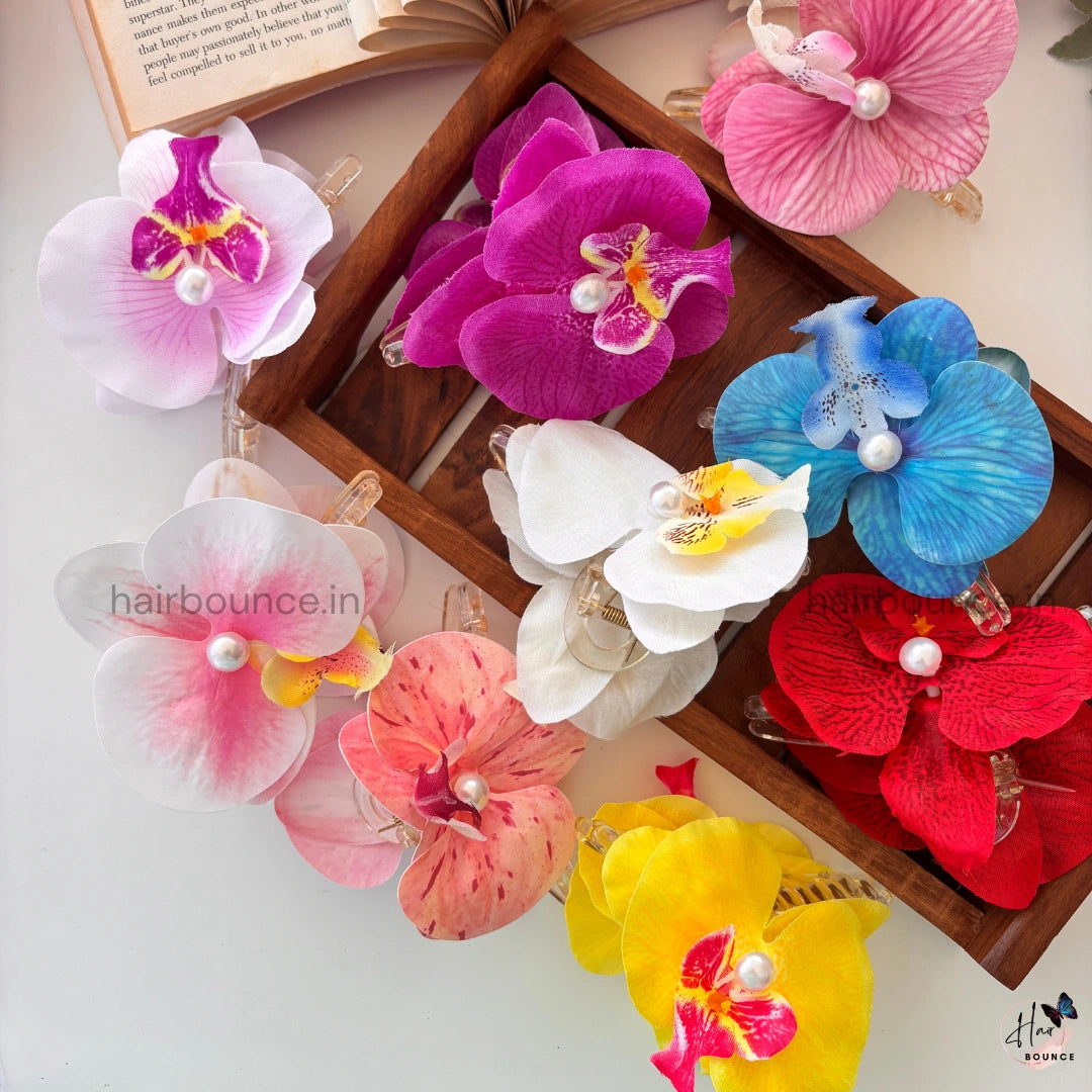 Elegant orchid-inspired hair claws available in a range of bright colors, each adorned with a pearl centerpiece. Lightweight yet secure, these floral clips are perfect for festive occasions, weddings, or adding a fresh bloom to your everyday style.