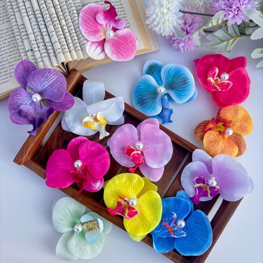 Beautiful orchid-inspired hair clips in a variety of vibrant shades, each finished with a pearl at the center. Perfect for festive occasions, weddings, or adding a fresh floral charm to your everyday hairstyle.