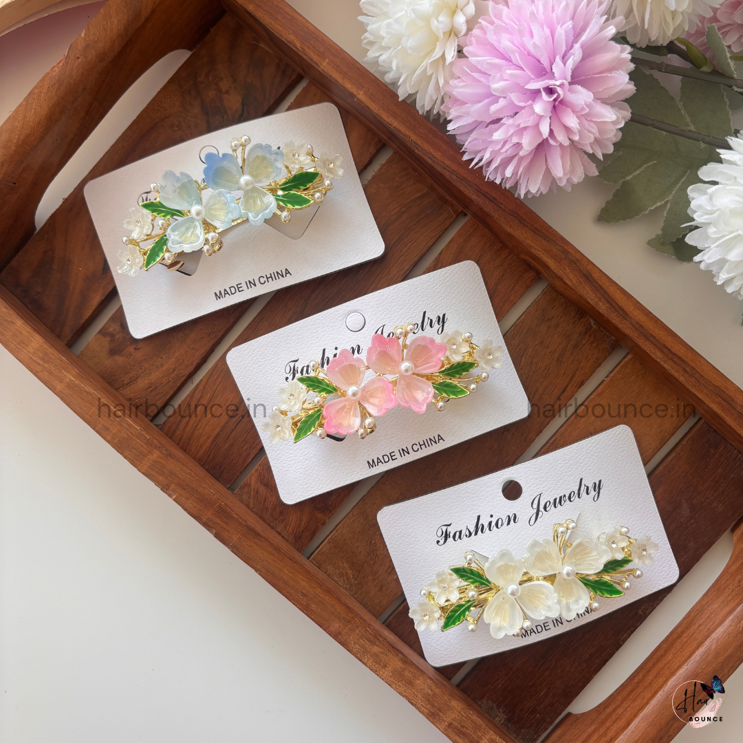 Delicately crafted with translucent floral petals, soft pearls, and golden leaf accents, the Pearl Blossom Center Clip adds a graceful charm to your hairstyle. Designed to sit beautifully at the center, this clip brings a touch of elegance to festive looks, casual outings, or special occasions. Lightweight yet eye-catching, it’s perfect for elevating both traditional and modern styles effortlessly.