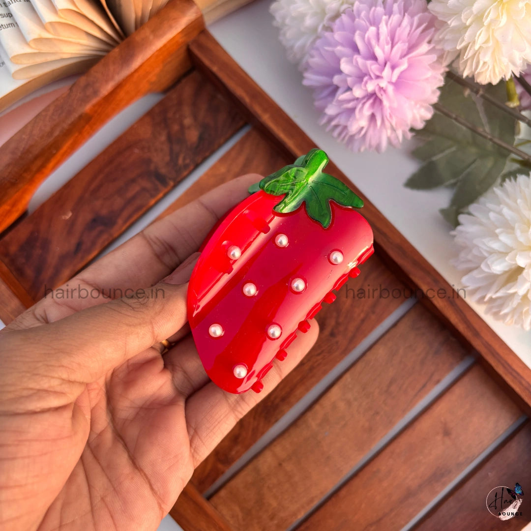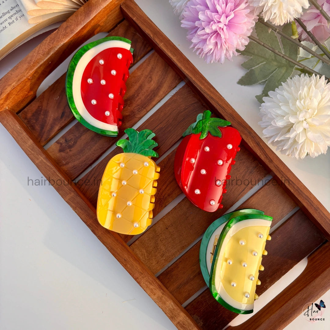 Add a playful sparkle to your hairstyle with our Pearl Fruity Charm Hair Claw. Designed in cute fruit shapes like watermelon, strawberry, pineapple, and citrus slices, this hair claw is beautifully detailed with tiny pearl accents for an extra touch of charm. Made with a glossy finish and a sturdy grip, it holds hair securely while staying gentle and comfortable to wear.