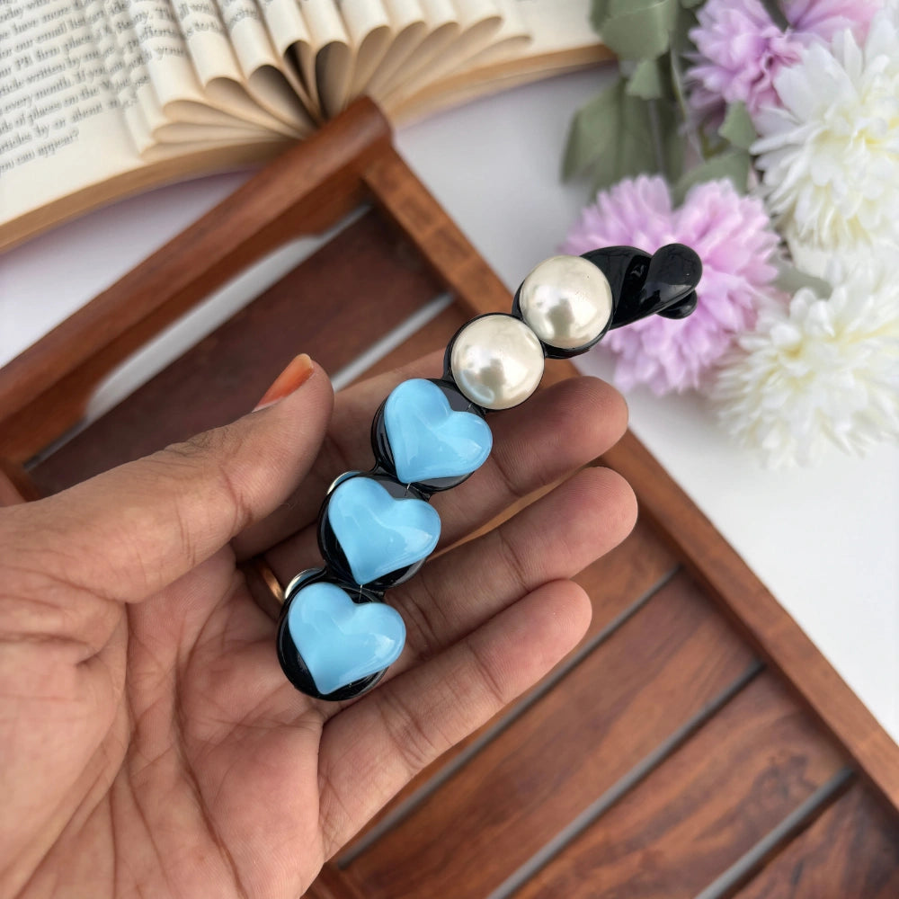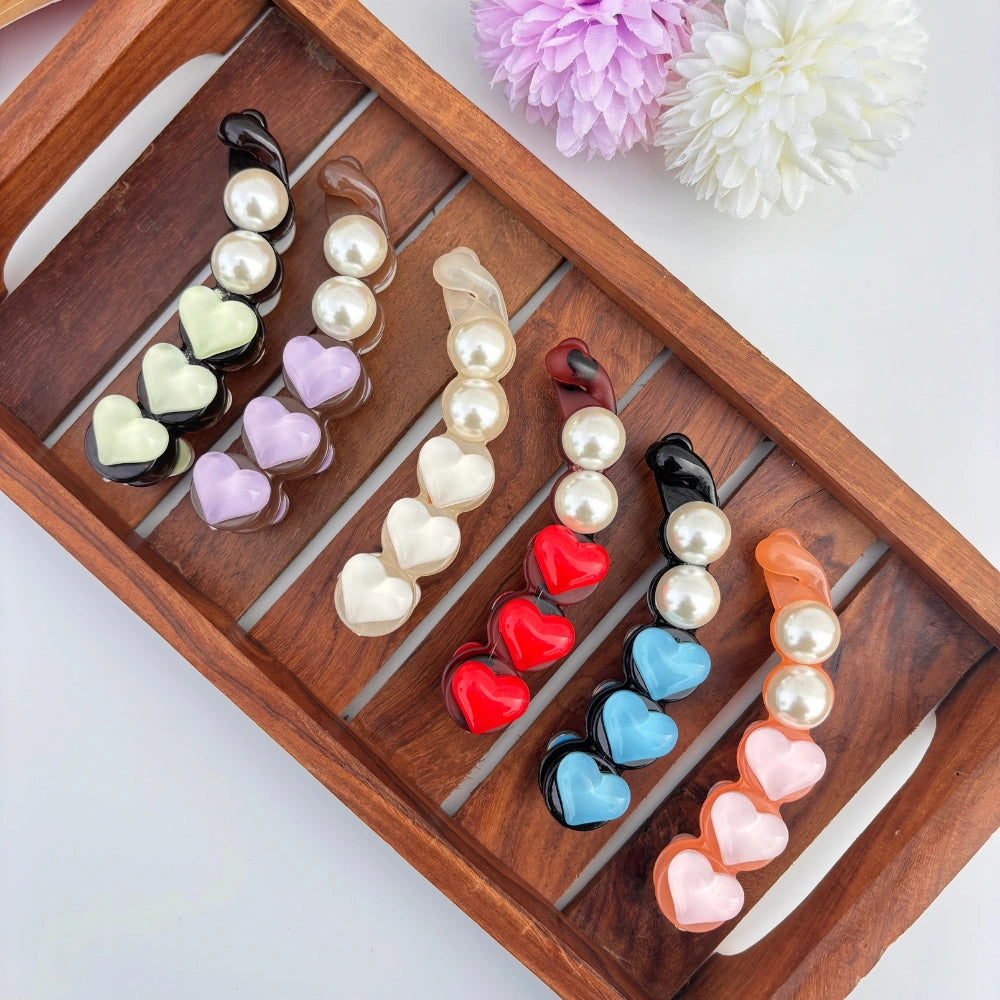 Stylish banana clips featuring glossy heart designs paired with pearl accents. Perfect for securing your hair with elegance, these multicolor clips add both charm and sophistication to any look.