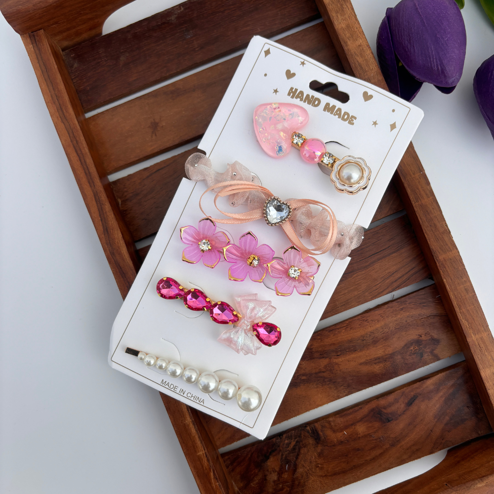A graceful collection of hair clips featuring pearls, florals, hearts, and bows in soft blush and vibrant pink tones. The perfect mix of sparkle and sweetness for dressing up any hairstyle with princess charm.