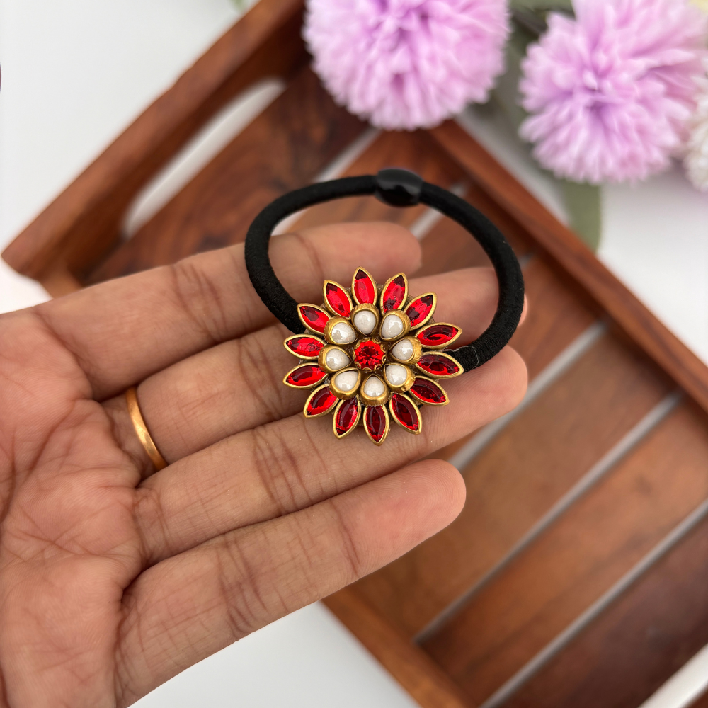 Add a regal touch to your hairstyle with this elegant Red Royale Hair Tie. Featuring vibrant red petals, pearl accents, and golden detailing, it’s perfect for festive occasions or ethnic flair.