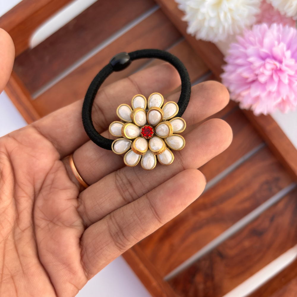 Adorned with double-layered pearl-like petals and a sparkling red gem at the center, this hair tie brings timeless elegance and floral charm to any hairstyle.