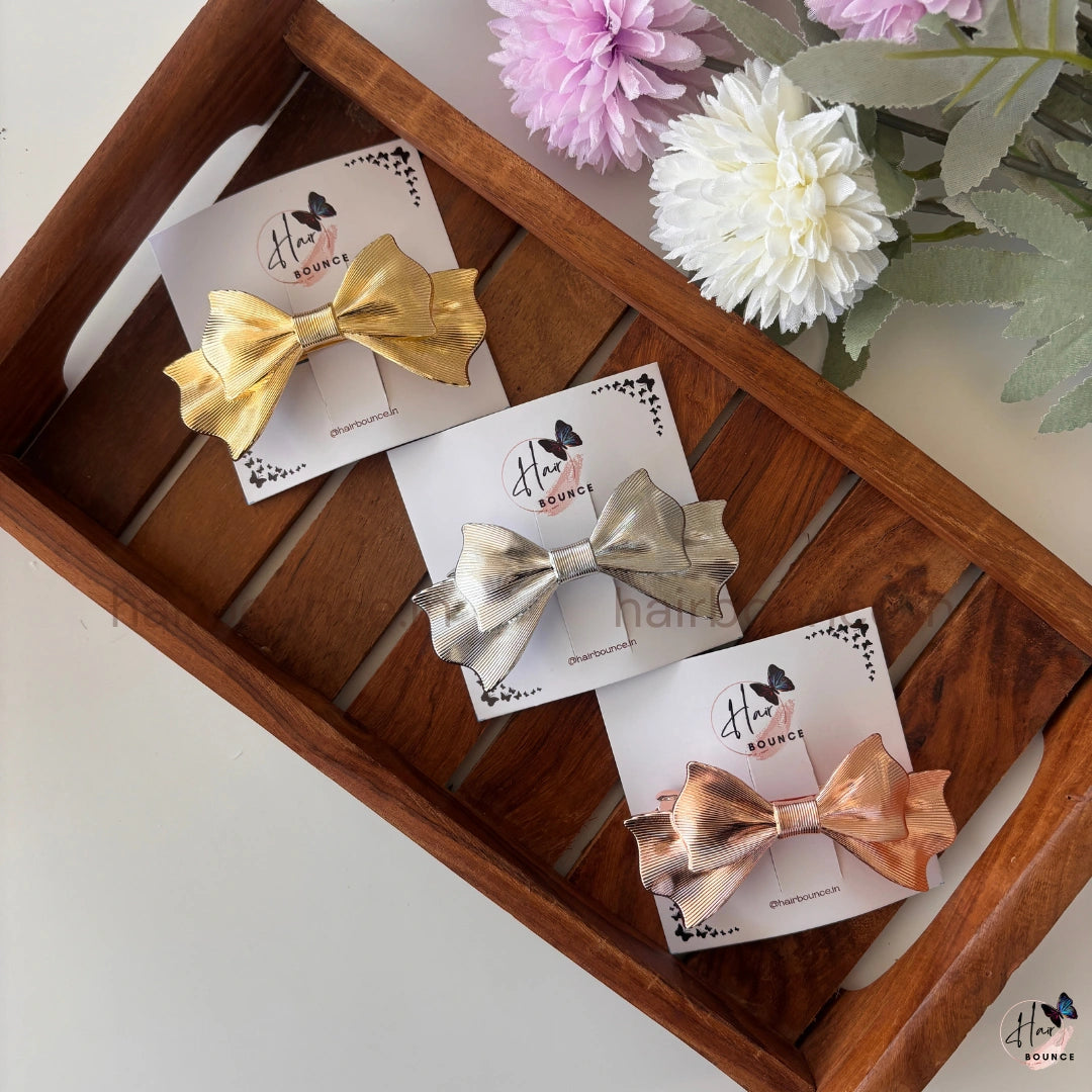 Turn heads with our Royal Luxe Layered Metallic Bow Hair Clip — designed with beautifully layered, flared edges and a premium ribbed metallic texture. This bold yet elegant bow adds dramatic shine and sophistication to your hairstyle.