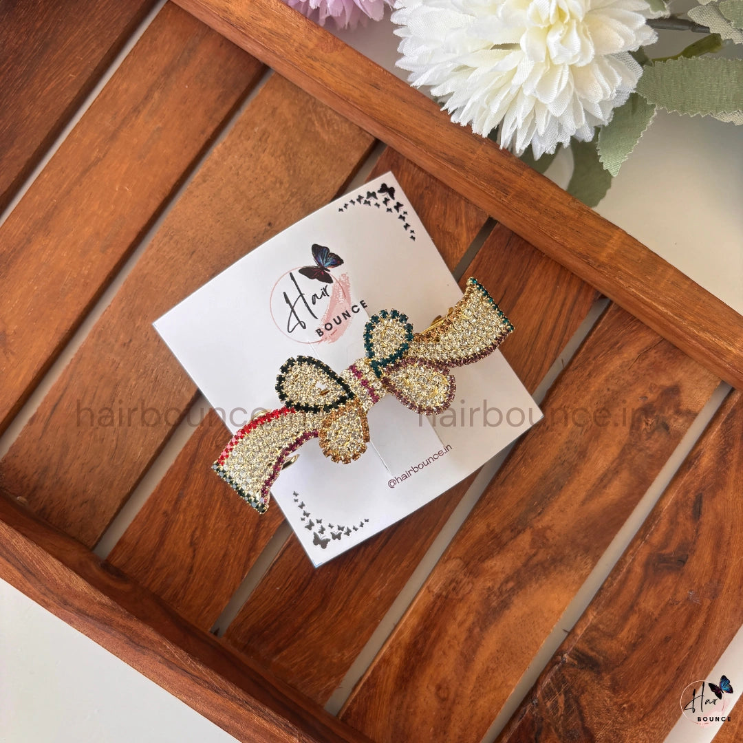 Add a touch of regal sparkle to your hairstyle with the Royal Radiance Crystal Bow Barrette. Designed in an elegant bow silhouette, this premium barrette features finely set high-shine crystals and multi-tone accents that reflect light beautifully. Its luxurious gold base and intricate detailing make it perfect for festive occasions, weddings, parties, or elevating your everyday look. The secure clasp ensures a firm hold while maintaining comfort throughout the day.