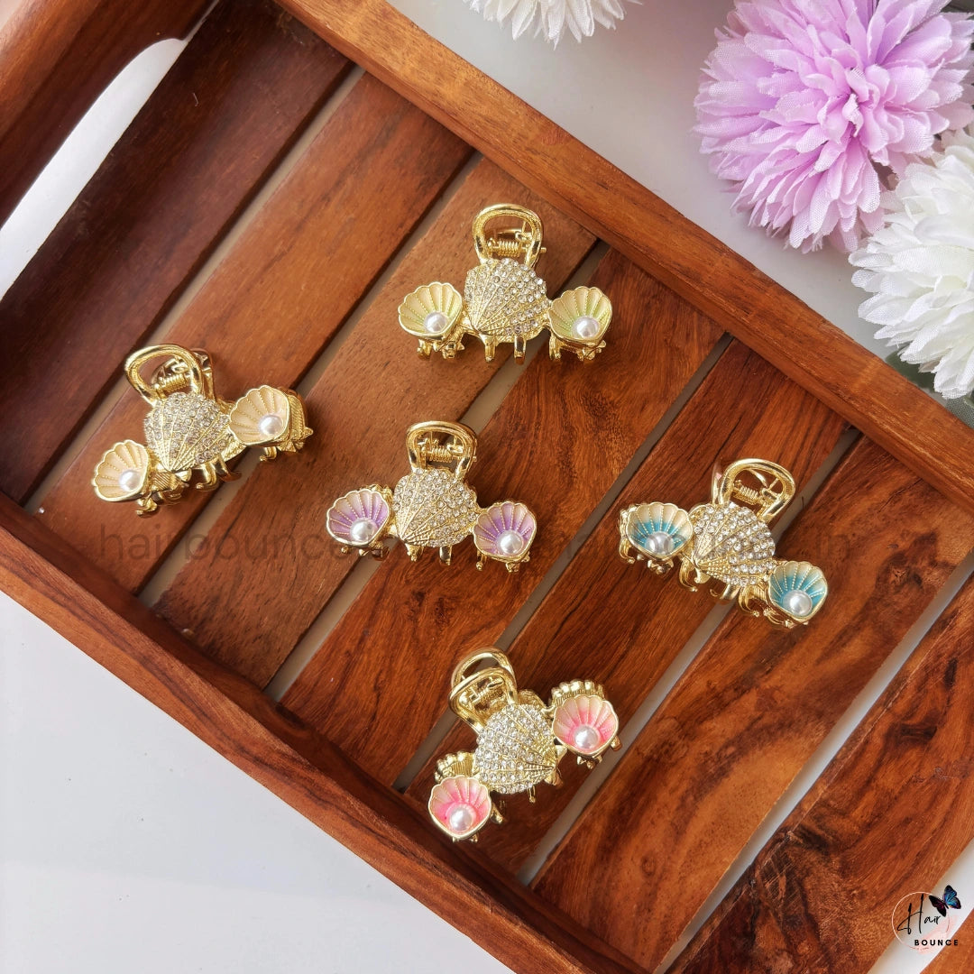 Elevate your hairstyle with our Royal Seashell Pearl Premium Metal Hair Claw – Medium Size, a luxurious accessory inspired by ocean elegance. Crafted with a premium gold-tone metal base, this hair claw features a sparkling crystal-encrusted center shell paired with delicate enamel seashell accents and pearl details, creating a refined and graceful look.