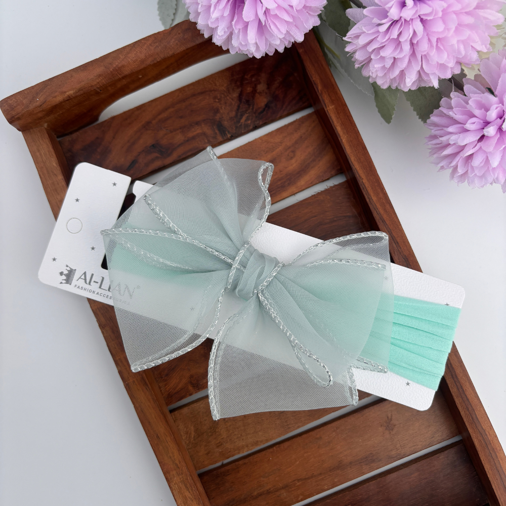 A soft and stylish headband featuring a large sheer bow with silver-trimmed edges. Available in a variety of pastel shades, perfect for adding a delicate touch to any outfit.