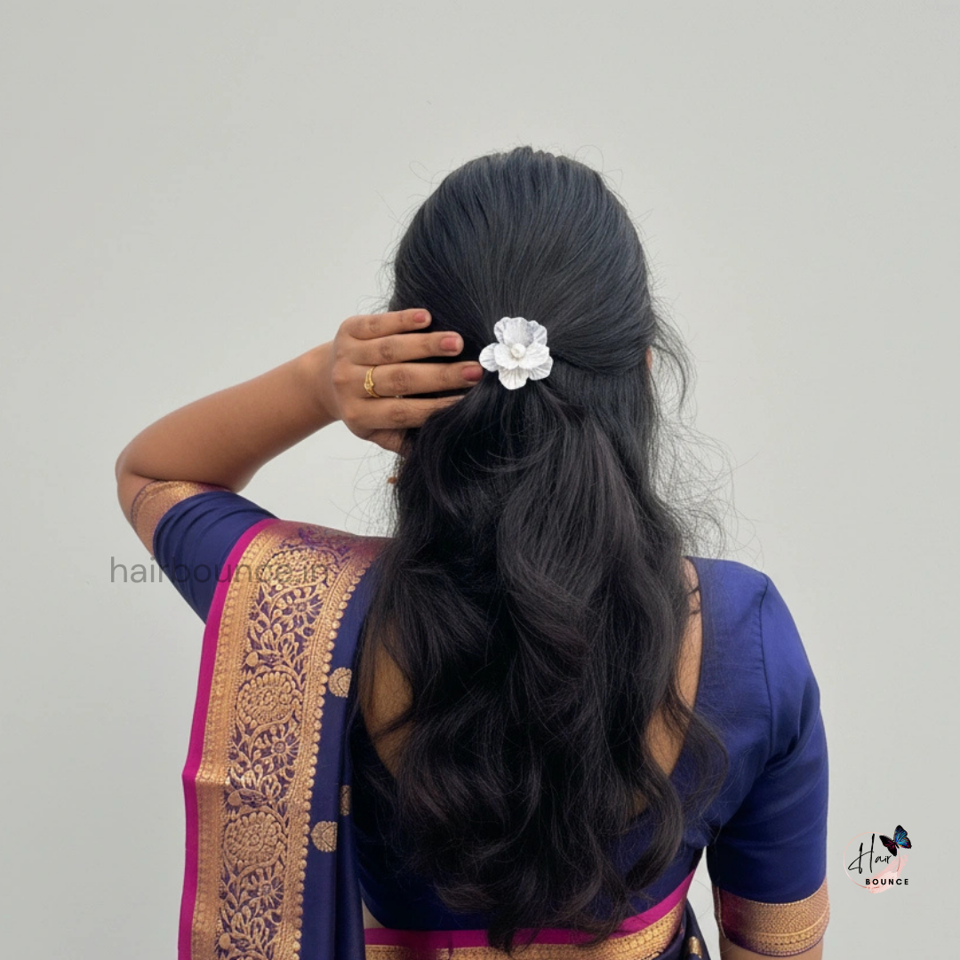 Elegant and classy, the Silver Shine Pearl Flower Hair Tie pairs shimmering silver petals with a glowing pearl centerpiece. A perfect accessory to add sophistication to your hairstyle, whether for daily use or festive occasions.