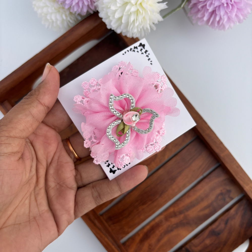 Floral clips crafted with soft lace petals and embellished with rhinestone-studded bows — perfect for adding a twinkle of elegance to partywear or festive hairstyles.