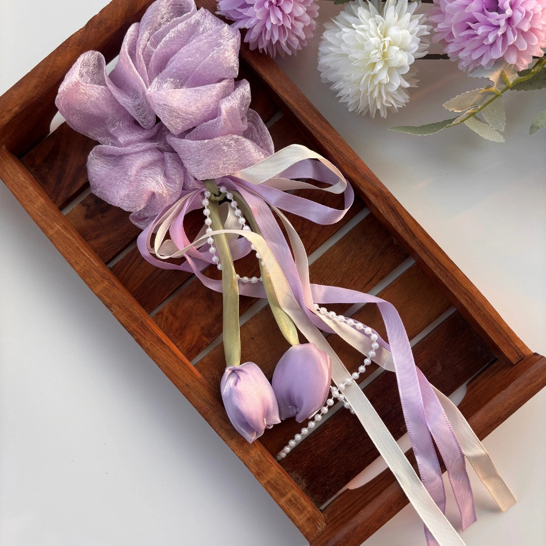Wrap your hair in soft elegance with our Tulip Whispers Scrunchie — a delicate blend of shimmer fabric, satin ribbons, and dainty tulip charms. Each scrunchie features flowing pastel ribbons and pearl strings that drape gracefully, adding a dreamy, romantic touch to any hairstyle.