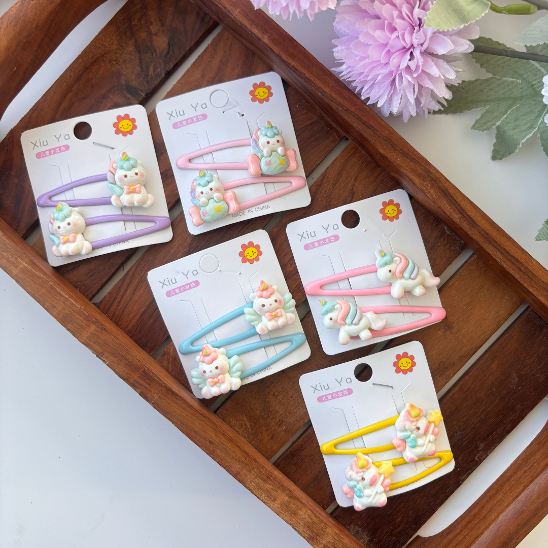 Each pair features adorable pastel unicorns and fantasy-inspired designs — full of sparkle, charm, and color. Perfect for adding a touch of magic to your little one’s braids, ponytails, or open hair looks!