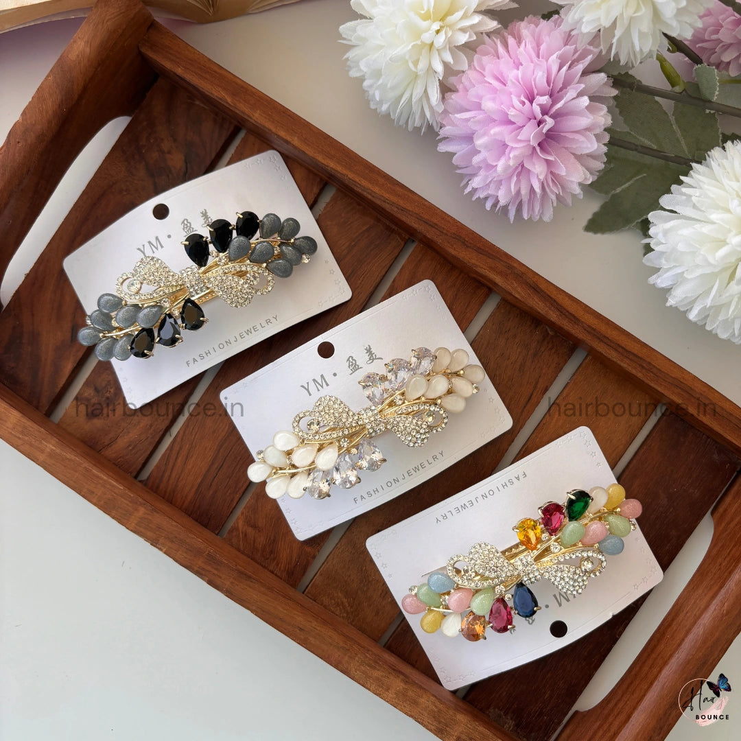 Elevate your hairstyle with the understated elegance of the Velvet Pearl Bow Bar Clip. Designed with soft matte pearl beads paired with faceted crystal accents, this clip features a sparkling bow centerpiece that adds a refined, classy touch. The harmonious mix of textures creates a luxurious yet graceful look, while the sturdy bar clasp ensures a secure and comfortable hold. Perfect for festive occasions, office wear, parties, or elegant everyday styling, this clip is a timeless accessory with modern charm.
